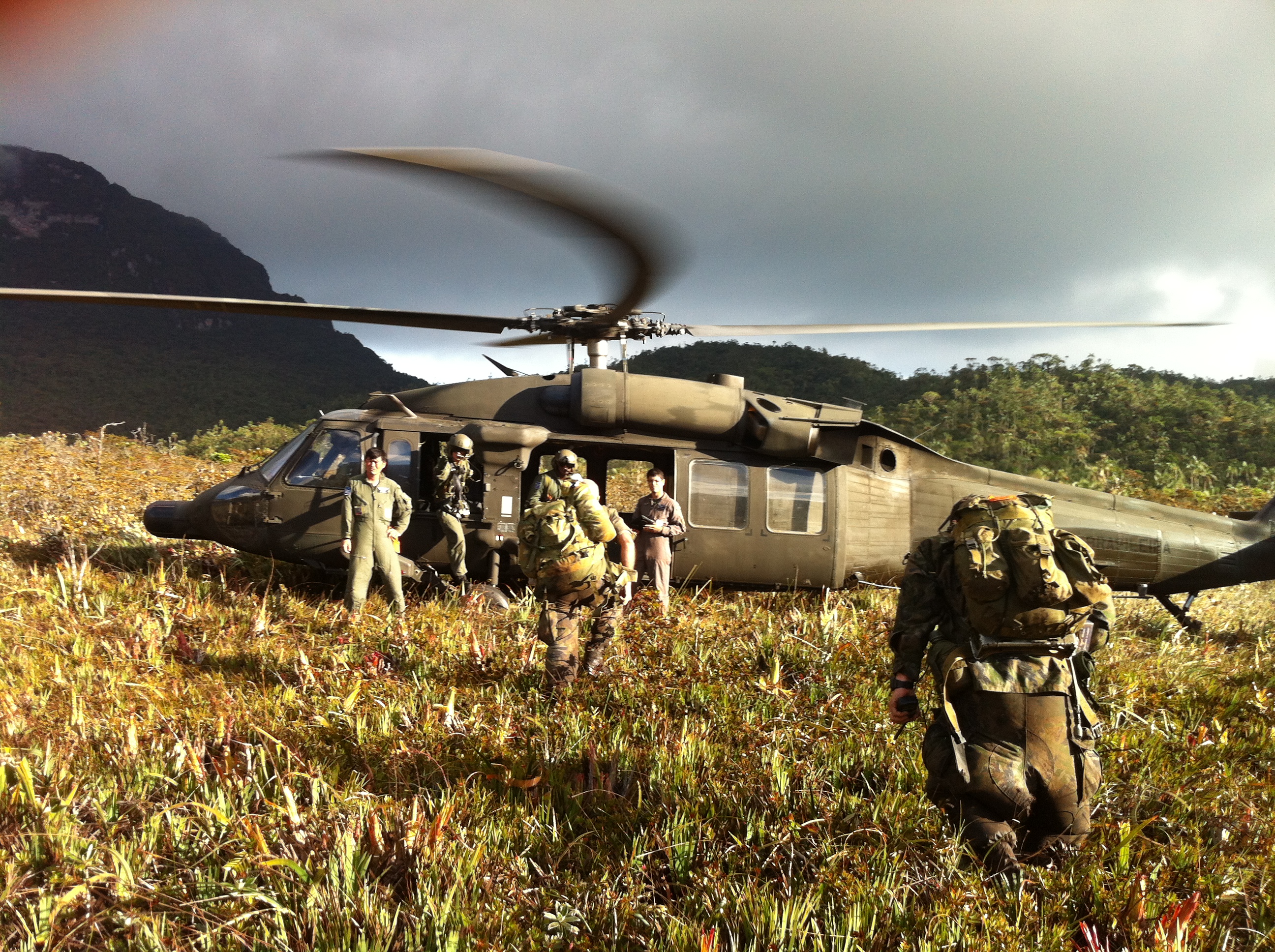 Segundo o Tenente Lopes, a equipe ainda precisou se adequar à falta de estradas para o transporte de equipamentos, alimentos e água. “A gente não contava com meio terrestre nenhum. Todo o deslocamento e apoio foram aéreos, através do Black Hawk.”